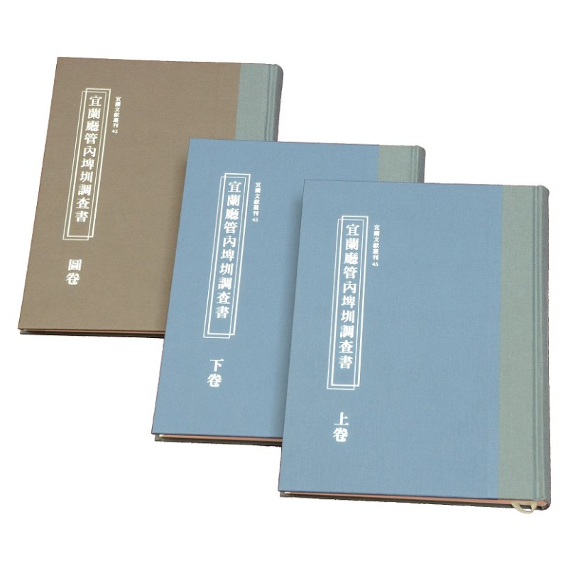 日本時代臨時臺灣土地調查局搜集、整理有關宜蘭地區之埤圳資料,並於明治38年(1905)三月印刷、發行《宜蘭廳管內埤圳調查書》上、下二卷。其中詳載宜蘭各埤圳組織之受益及灌溉區域、投資方式及組成沿革、管理及修繕方式、水租及相關費用等,並收錄嘉慶初年以迄日本時代初期之水利文書329件。中譯本沿用原書名,並依原書篇幅分作上、下二卷,但特別將各埤圳圳路圖抽出,與重繪、新繪之圳路圖合併成冊為圖卷,以利相互參照。